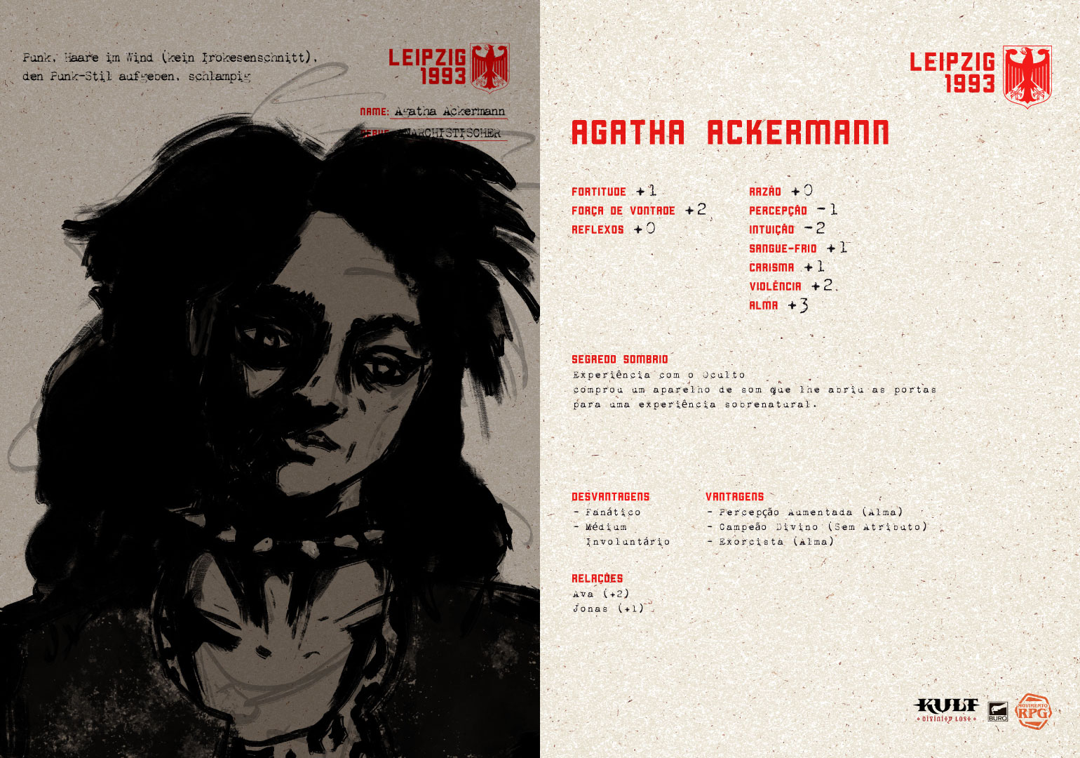 Agatha Ackermann é uma personagem criada por Fernanda Cizescki para a campanha de Kult: Divindade Perdida do Movimento RPG, Crônicas de Leipzig. Para saber como montar sua ficha neste sistema, acesse nosso vídeo de explicação Clicando Aqui!