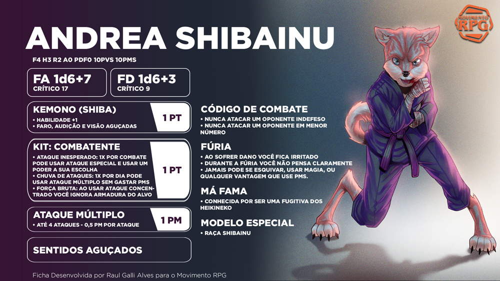 Este personagem foi criado pelo Karina Cedryan para o evento 1º Torneio de Artes Marciais do Movimento RPG.