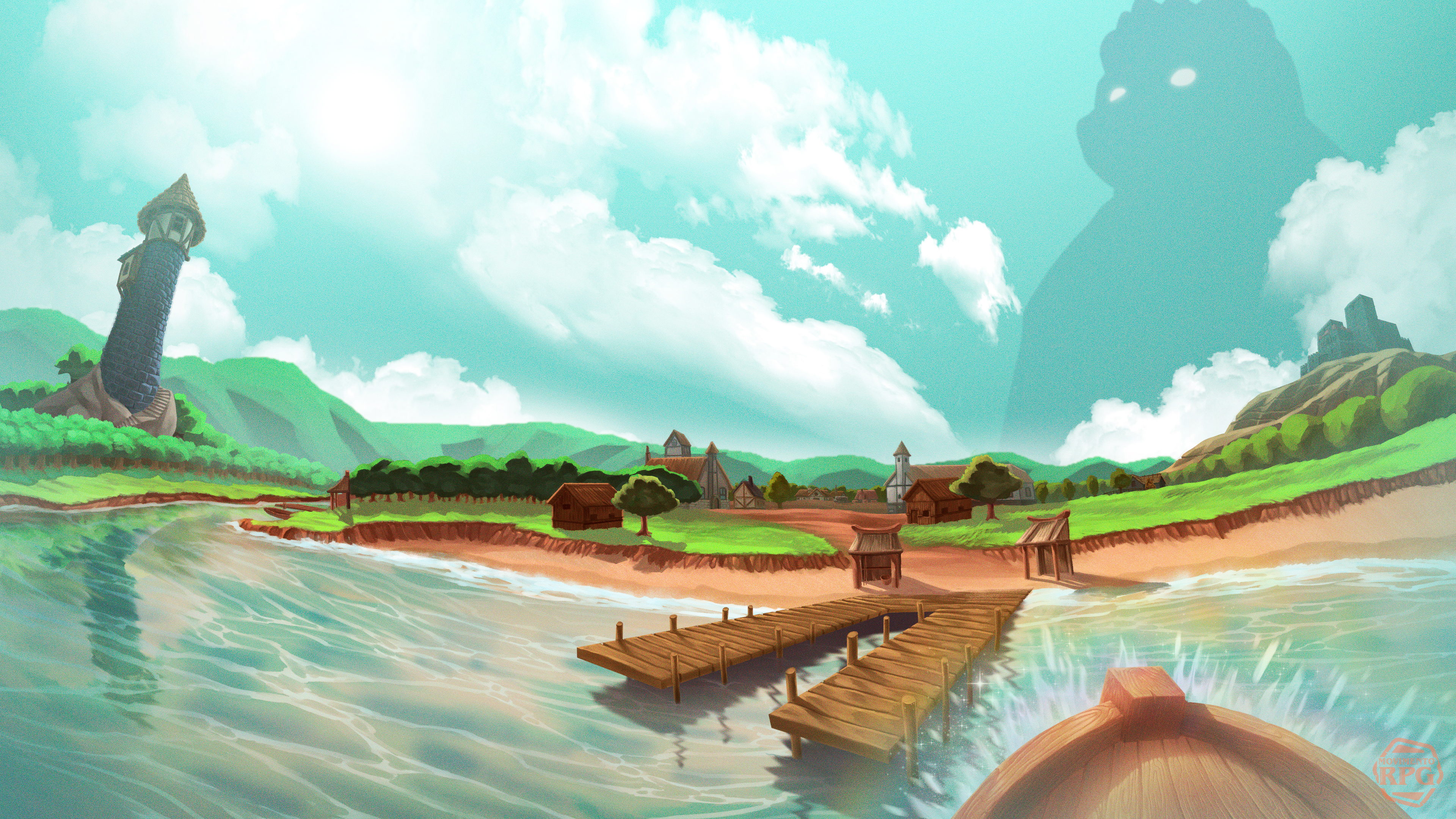 Baixe o wallpaper ilustrado por Marcos Oliveira da Chegada da Argonau na Vila de MRPG, financiado através das metas da Twitch durante as lives da Guilda dos Guardiões.