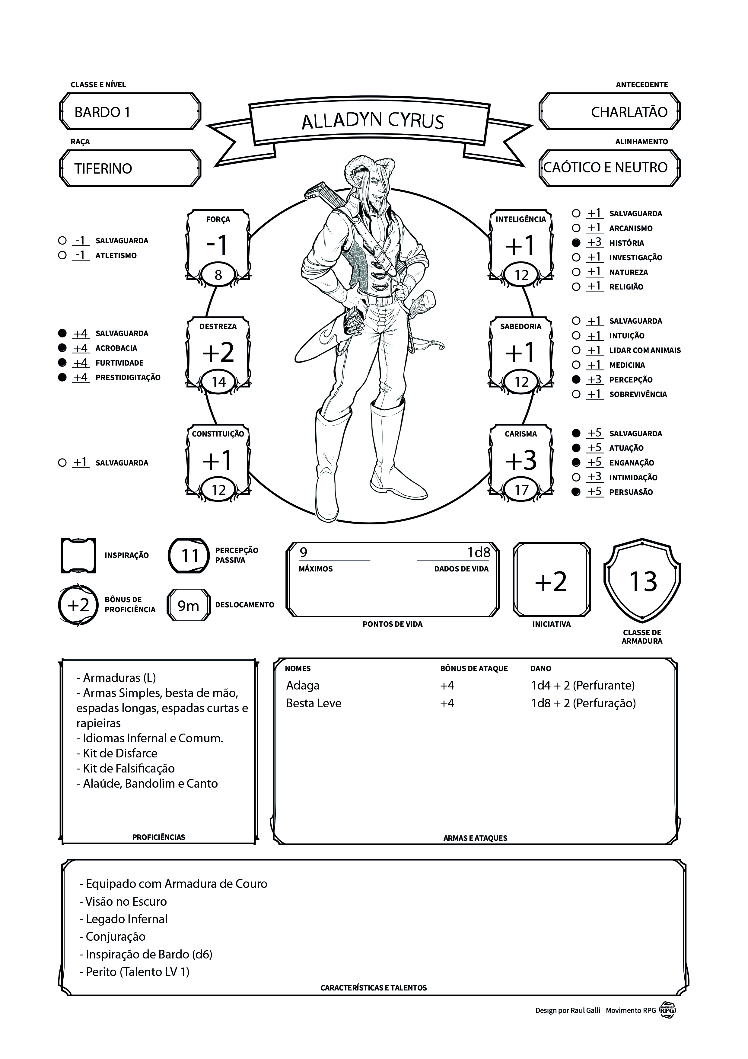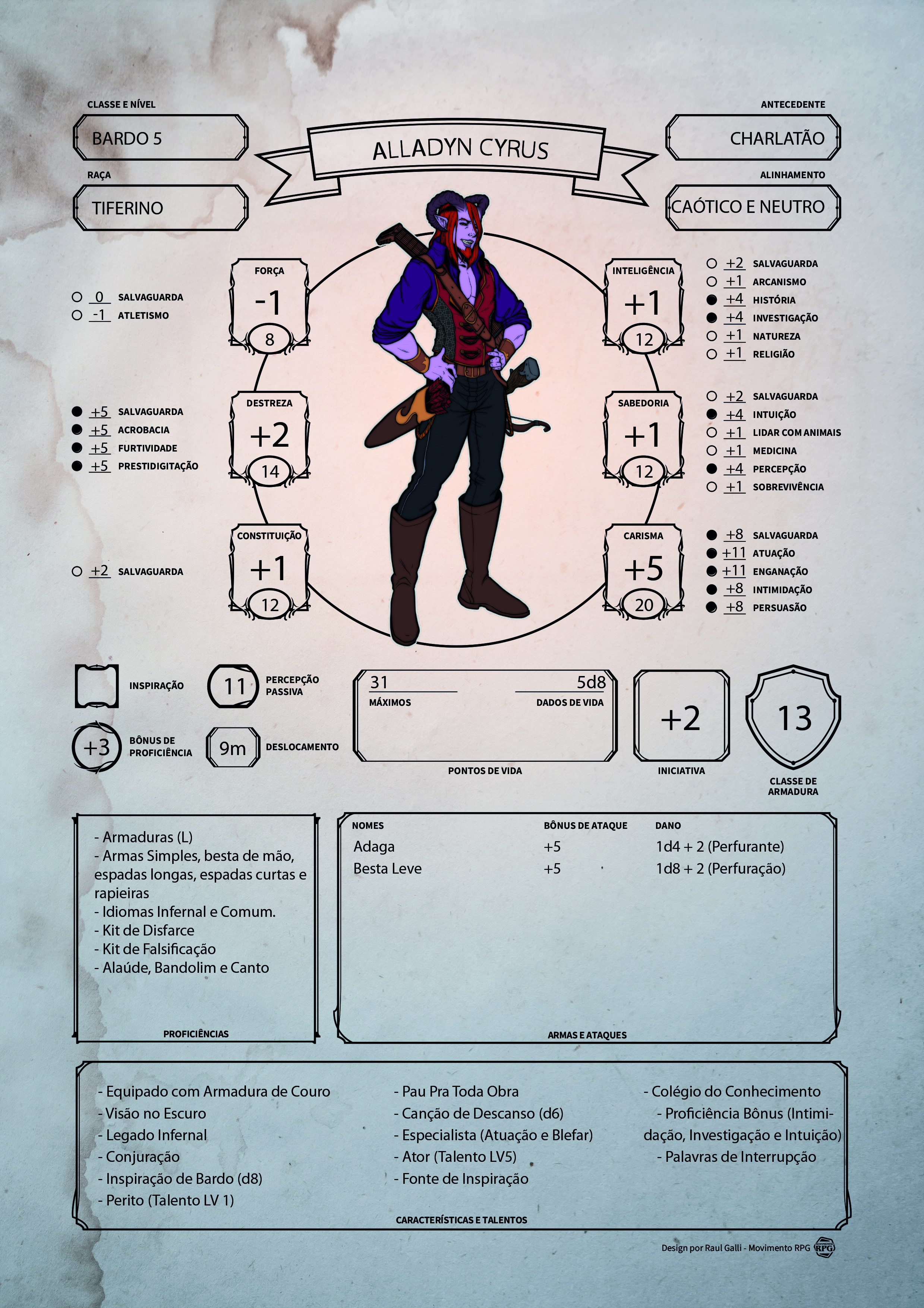 Alladyn Cyrus é um personagem criado por Filipe Fontes, para compor a Guilda dos Guardiões do Movimento RPG, nossa campanha recorrente que utiliza o D&D 5ª Edição como sistema.